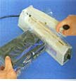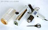 シュリンク包装機 ●パックする商品の大きさにあわせて(少し大きめに)フィルムをカットします。 ●商品をフィルムの中に入れ、もう一方の開口部をシールして下さい。 ●フィルムの収縮を妨げないようフィルムの隅をはさみでカットし空気穴をあけます。 ●ヒーティングガンで溶断面から順に熱風を送り、フィルムを収縮させると、きれいにパック出来ます。(ちかずけすぎるとフィルムの溶ける恐れがありますのでご注意下さい。)